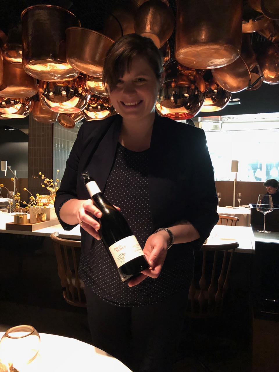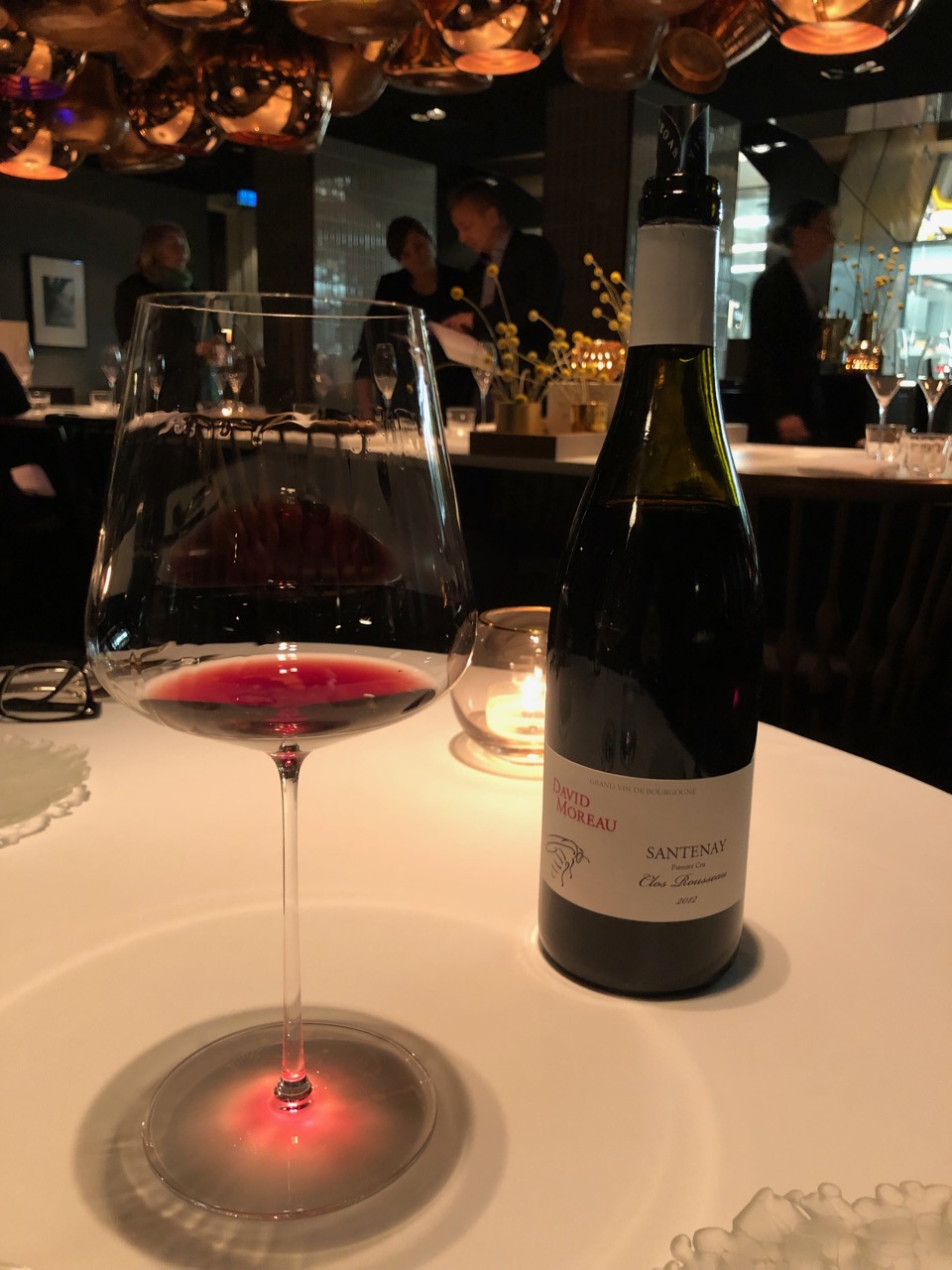 A carta de vinhos era muito especial. Como aperitivo, começamos com borbulhas rosés divinas de um pequeno produtor francês, que nos foi indicado pela eficiente sommeliére. Adoro conversar com quem entende muito de vinhos, sempre aprendo muito, e anoto todas as boas dicas. Para acompanhar os pratos, optamos por um Santenay David Moreau que também estava muito bom.