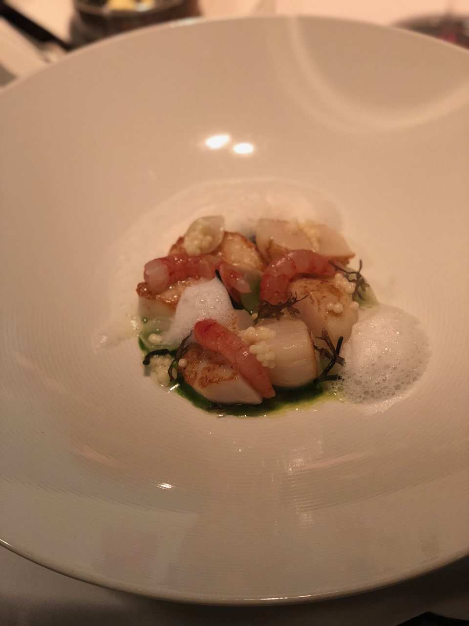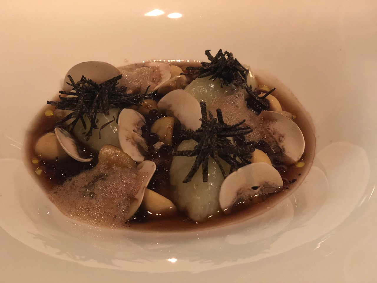 Nossa visita ao Cinco foi impecável! Como entrada, pedimos vieiras e champignons, divinamente bem preparados. Como prato principal, peixe com polenta para meu marido e para mim, o melhor risoto de champignons que já comi. Sob o prato, pequenas bolinhas de “jus”se desmanchavam na boca ao degustá-las. Reconheci ali traços da culinária fusion, marca registrada dos chefes espanhóis. Estava simplesmente delicioso.