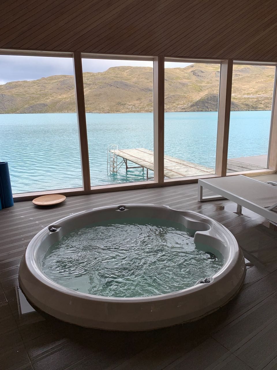 A 100 metros dali, no prédio anexo, encontramos o spa, com dois quartos de massagem, uma piscina coberta aquecida, sauna e quatro jacuzzis ao ar livre e com vista para o Rio Paine.