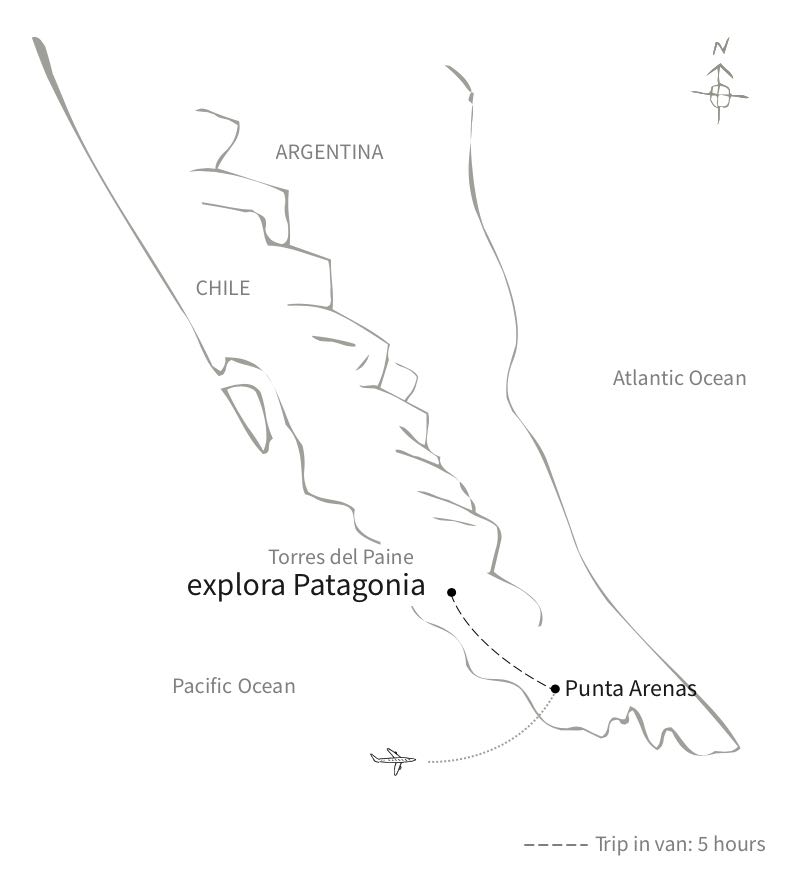 De Santiago: há vôos diretos do Aeroporto Arturo Benitez para o Aeroporto de Punta Arenas, de duração de 3 horas e meia. O Explora Patagônia oferece dois horários por dia de transfers (inclusos na tarifa) que saem do aeroporto de Punta Arenas às 9:20h, e às 14:50h.