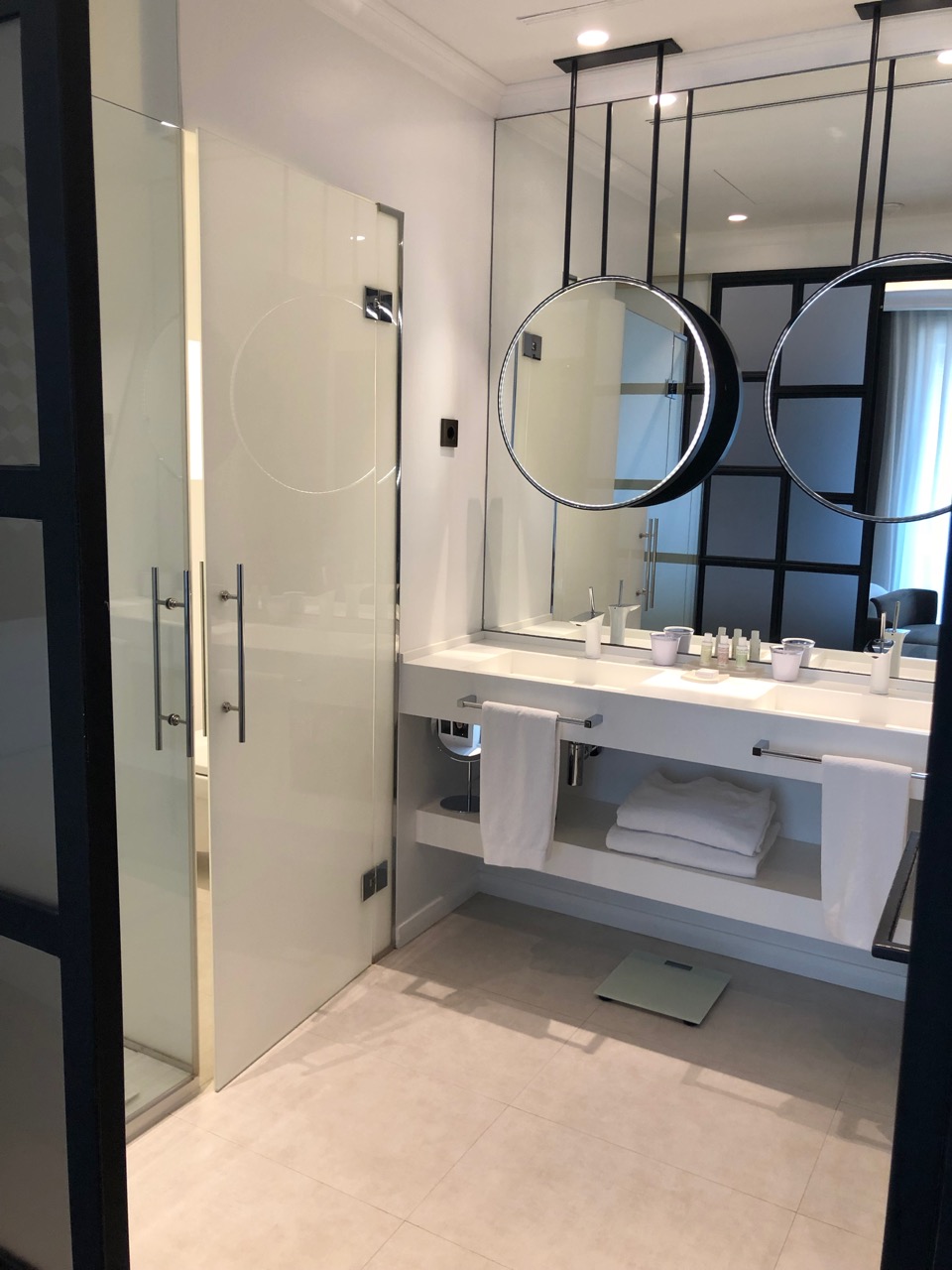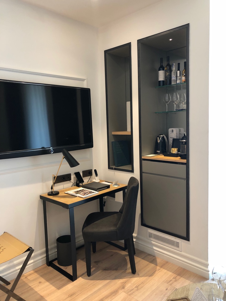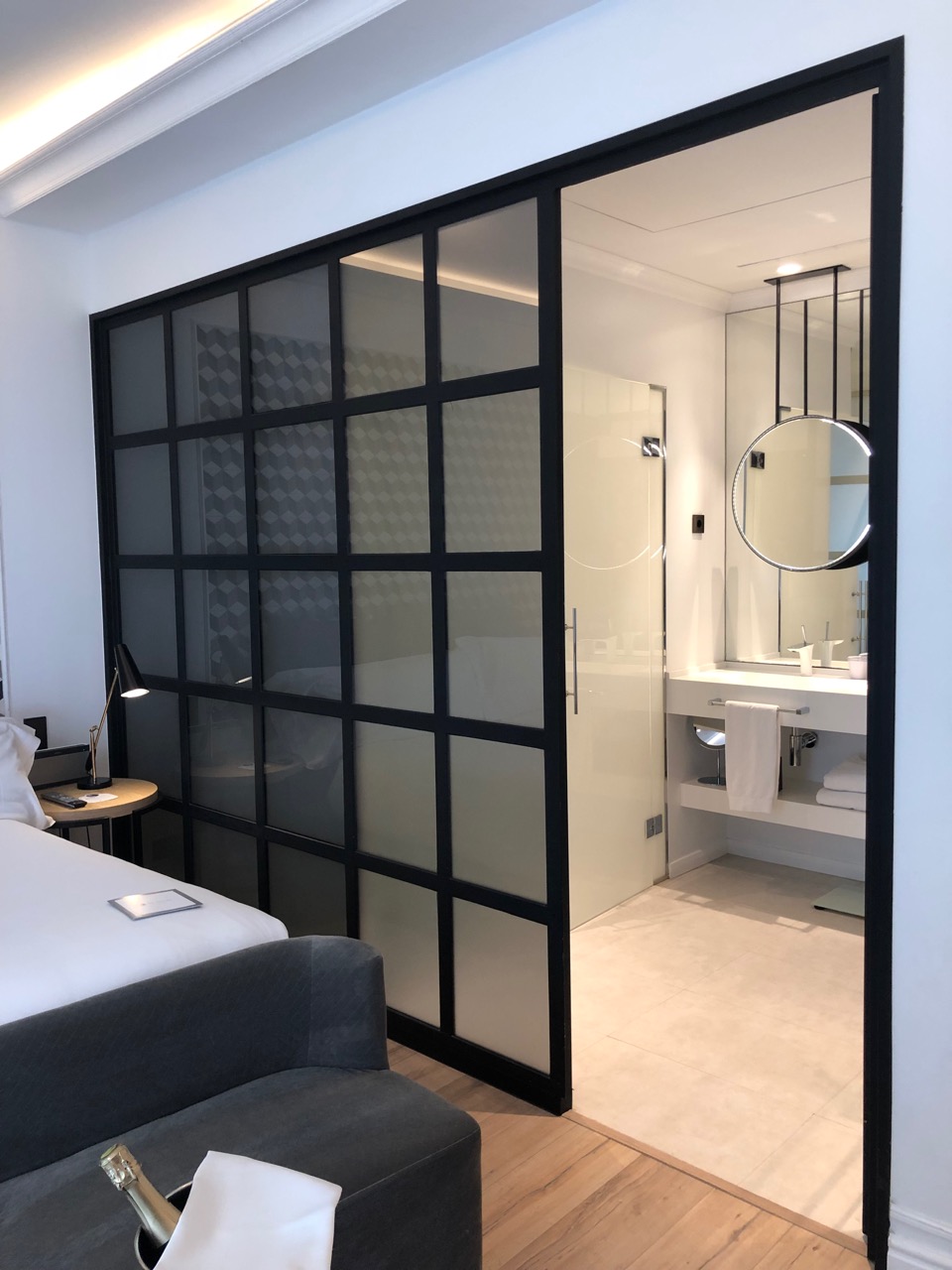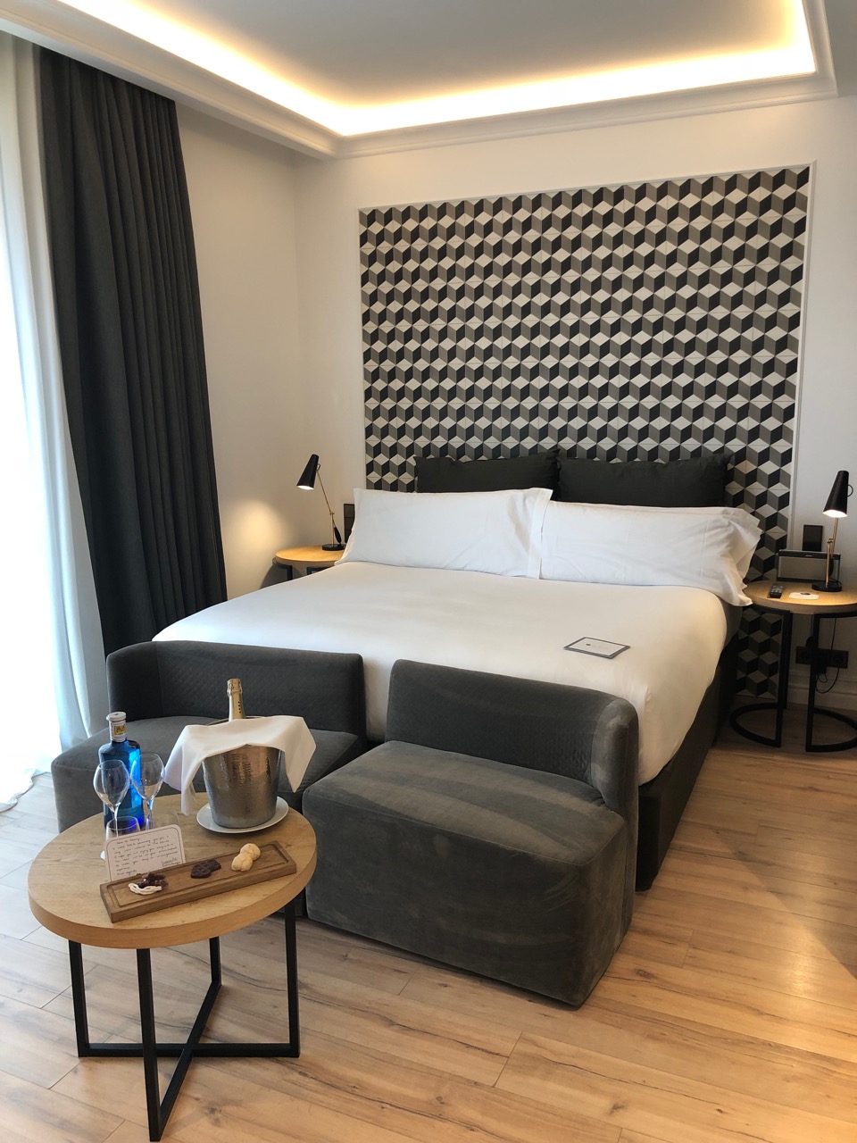 Os quartos do hotel são lindos, bem decorados e funcionais. Oferecem Tv de flat screen, cofre, máquina Nespresso, wi-fi interno e um wi-fi portátil, para o hóspede levar quando sair para visitar a cidade. O banheiro é um luxo, com chuveiros potentes, balança (nãaaaao!!), com um decor “clean”e moderno. Fomos recebidos com uma garrafa de Cava (espumante espanhol), biscoitinhos, chocolate e salame. E um belo cartão de boas-vindas! O tipo de mimo que adoro receber quando chego a um hotel.
