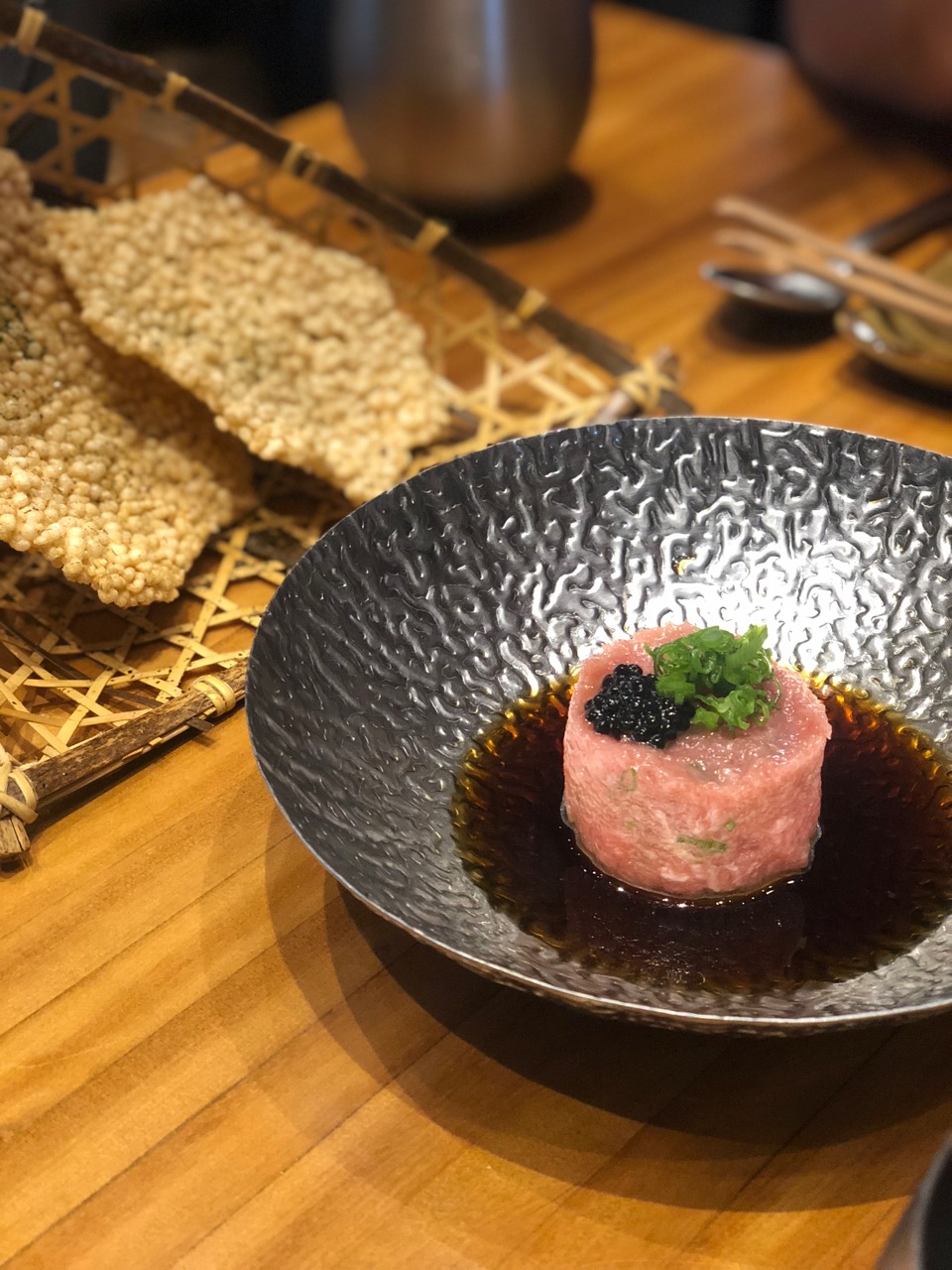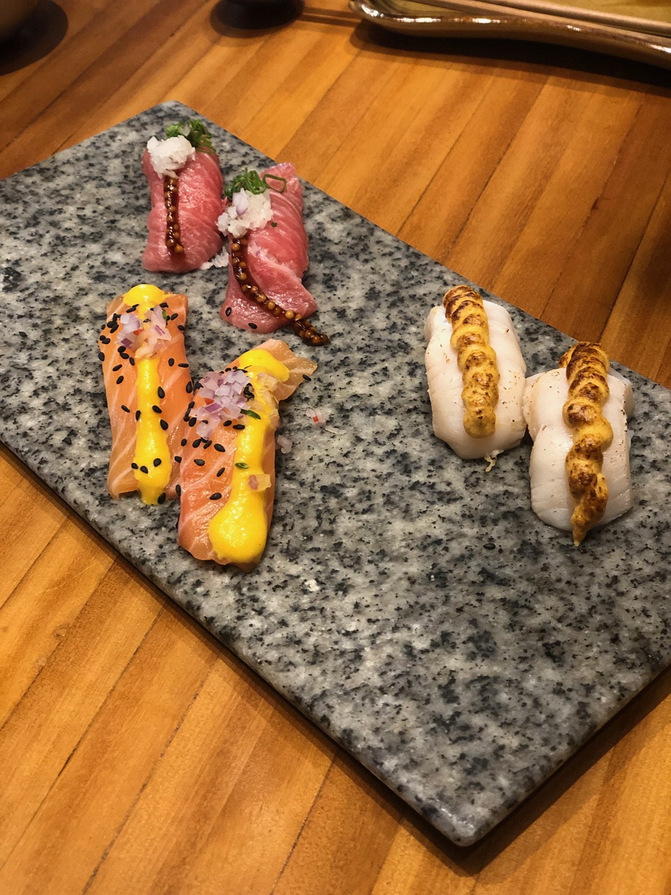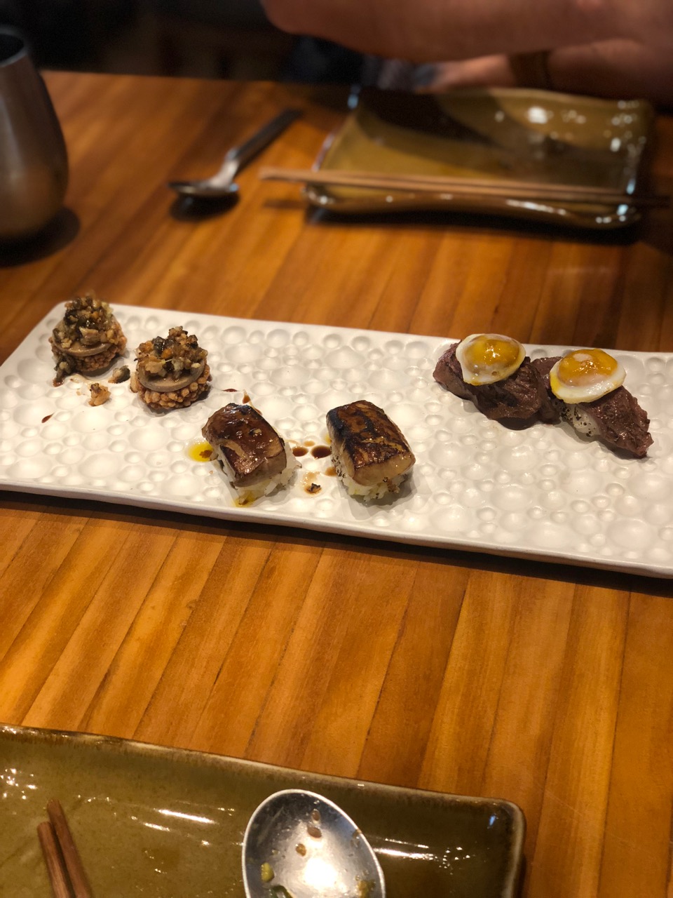 Pedimos um mini menu degustação e estava simplesmente dos DEUSES! Para começar, um sashimi de peixe branco maçaricado com molho agri-doce, duplas de nigiri de wagyu argentino, de pato e de foie gras, seguido de um tratar de atum delicioso com crisps de arroz. Na seqüência, mais nigiris de peixes (salmão, atum e peixe branco) com molhos divinos.
