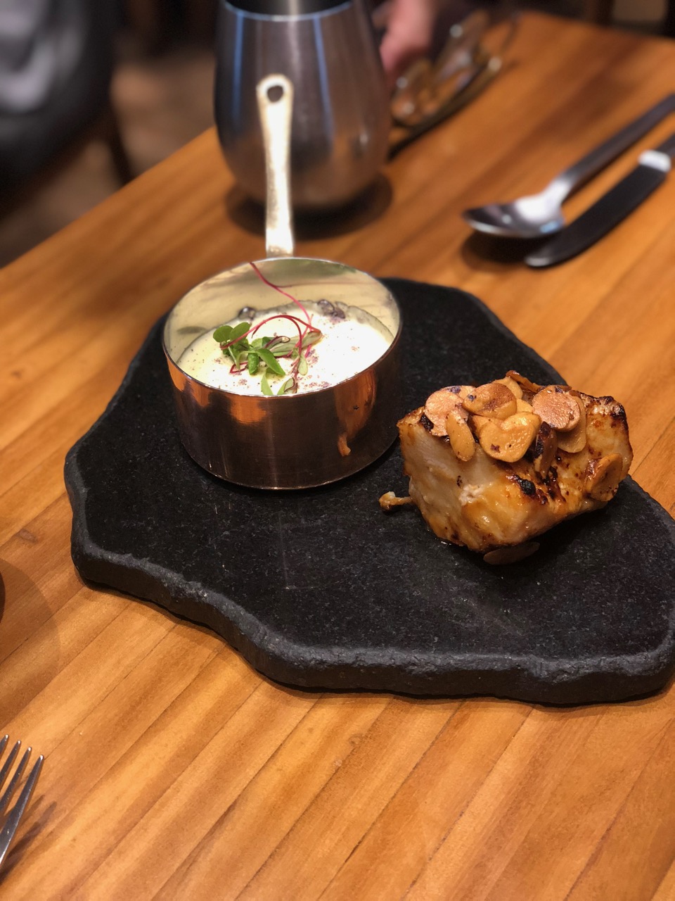 Os pratos principais estavam fantásticos. Um assado de tiras, que ficou cozinhando por 50 horas (e derretia na boca) com arroz colorido (fried rice) e um bacalhau confit com purê de batatas com queijo. O assado de tiras foi um dos melhores pratos que já comi na minha vida.