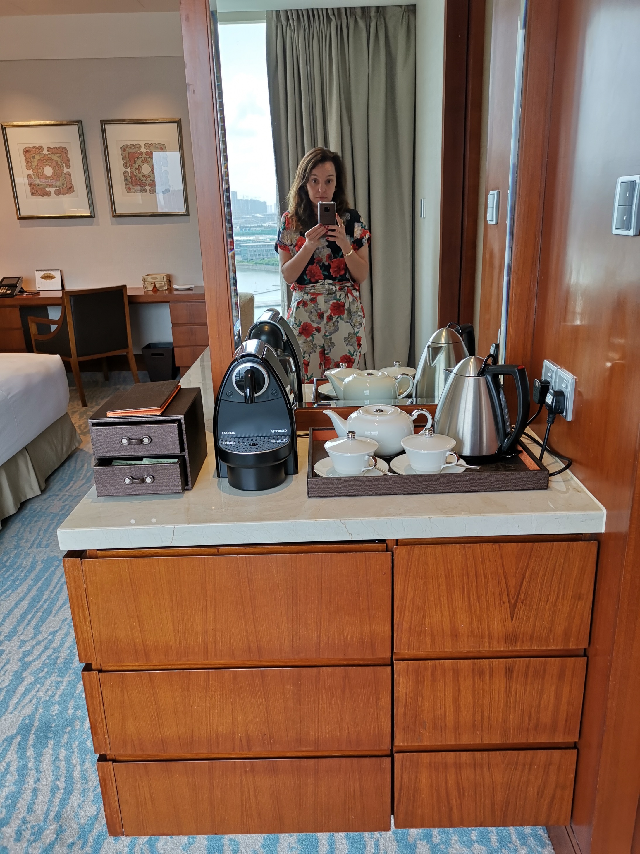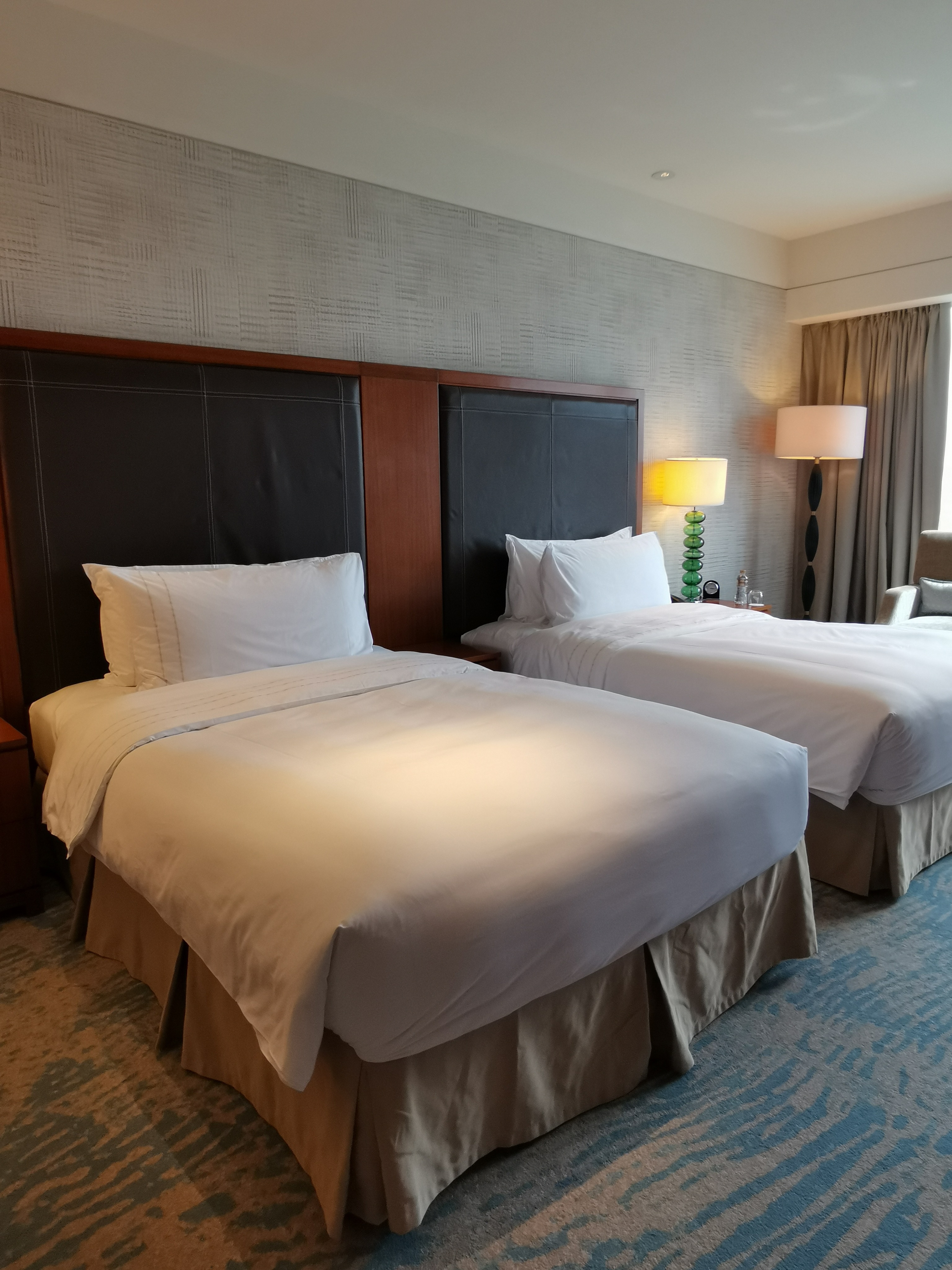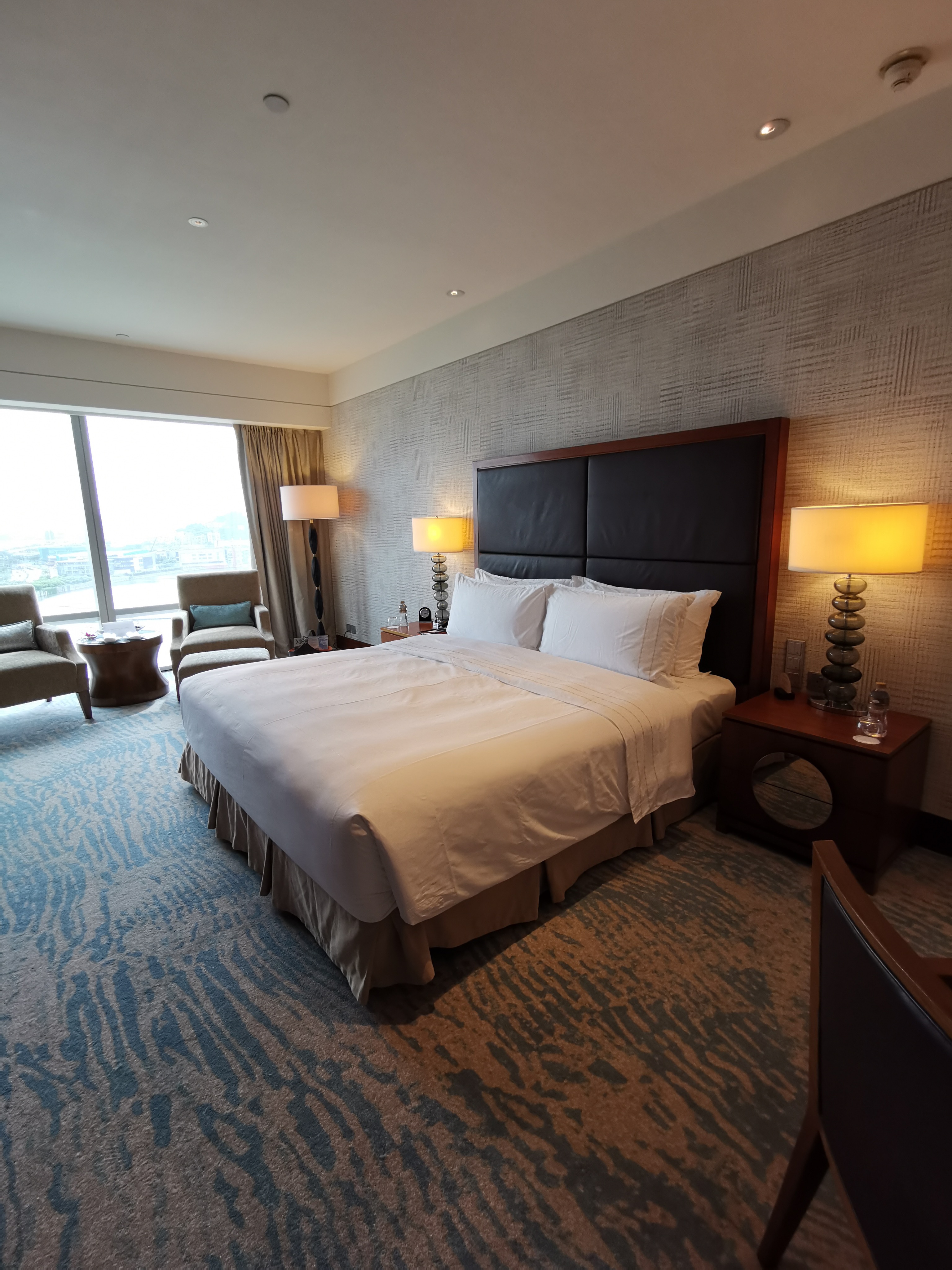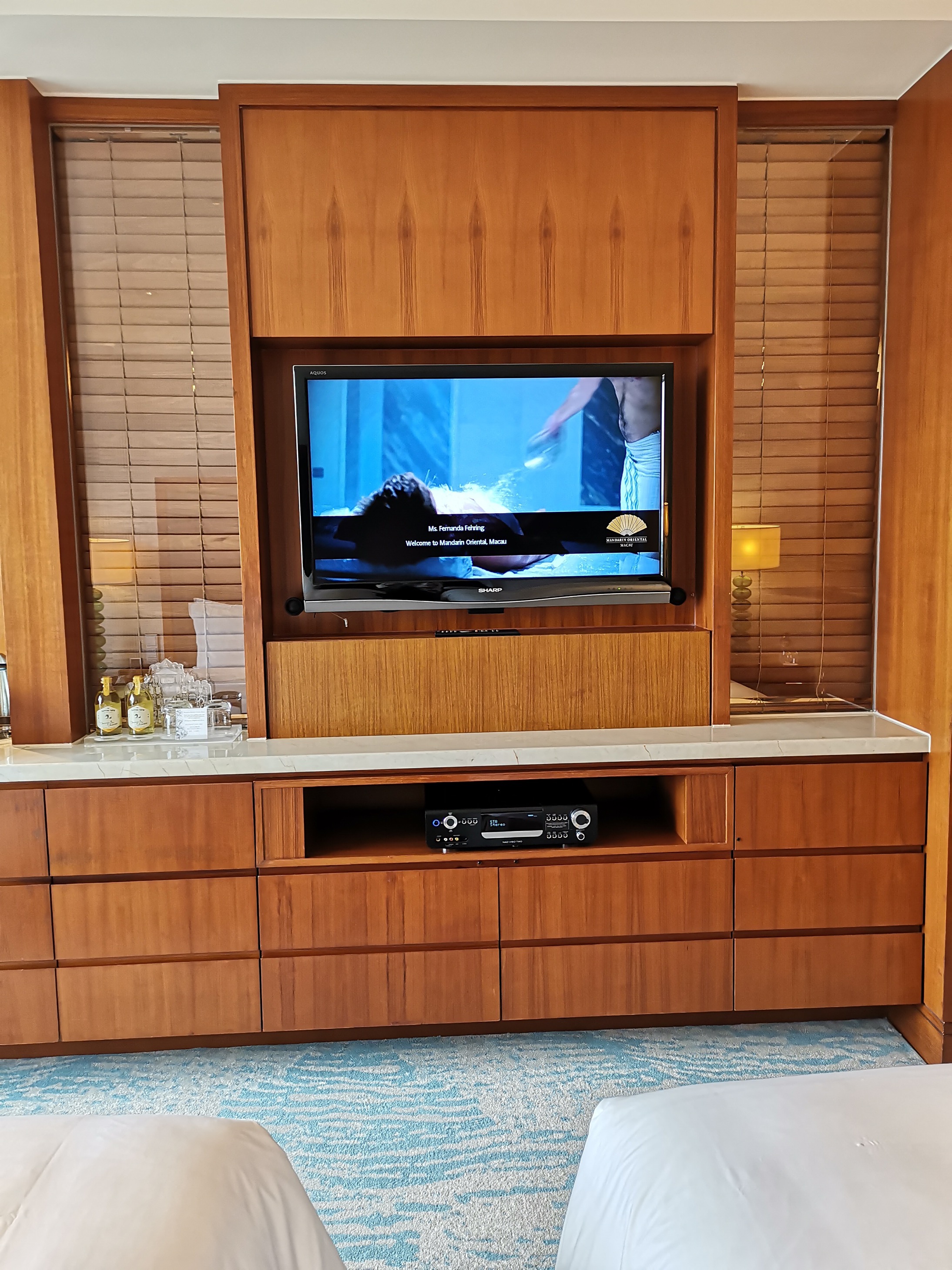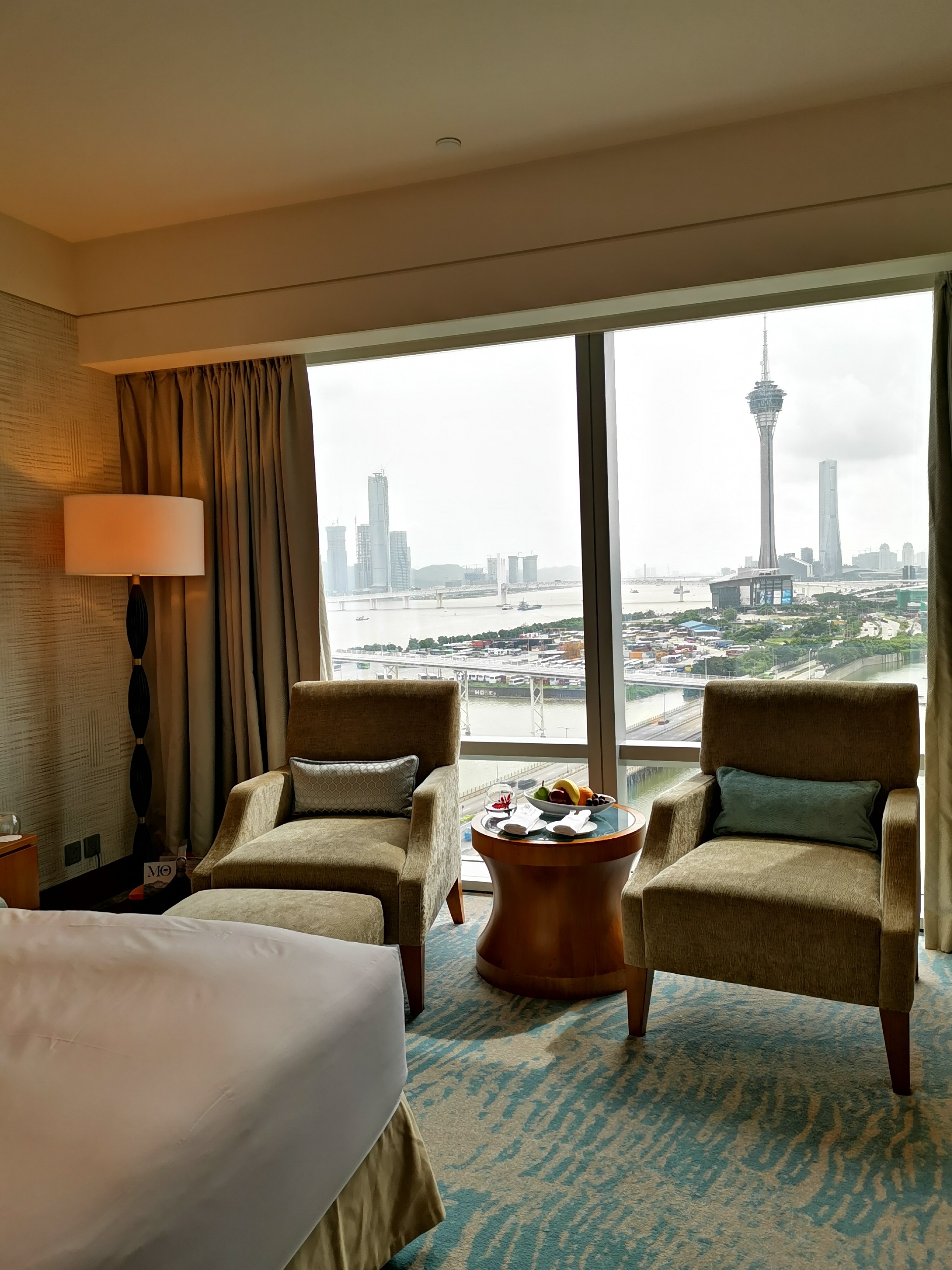 Ficamos em duas Deluxe Lake View Suites com comunicação. No meu quarto, uma cama king e no de nossos filhos duas camas queen. A vista para a Macau Tower era de capotar e os quartos eram extremamente confortáveis. Os dois tinham estação de café e chá, máquina Nespresso e um frigobar com ótimas opções de bebidas. Em um belo painel de madeira ficava a TV, com uma extensa lista de canais internacionais e opções de entretenimento à la carte.