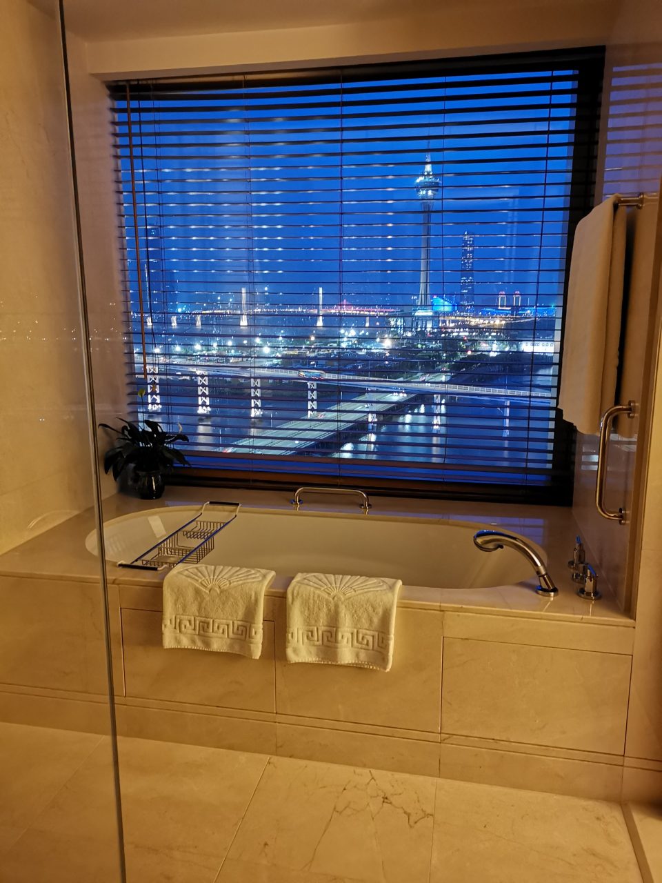 Os banheiros são lindos com uma super banheira estrategicamente posicionada como destaque. À noite, a vista para a Macau Tower iluminada era simplesmente encantadora.