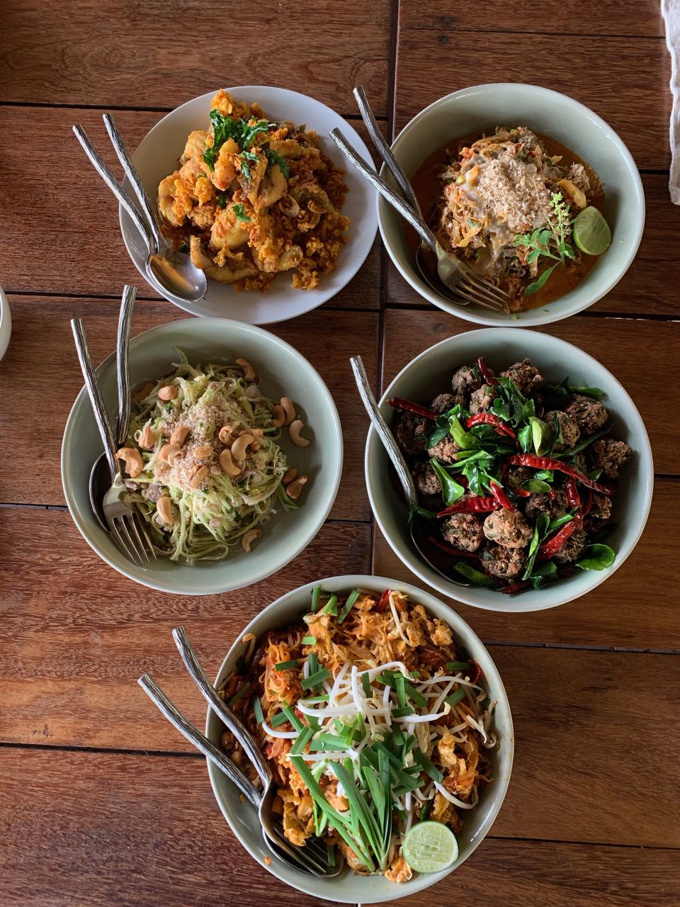 A Chef Pim, e o Chef Executivo Sandro Teixeira, nos ensinaram 5 pratos diferentes da culinária tailandesa. A tão famosa green papaya salad, almôndegas de porco, peixe ao alho e açafrão, o delicioso pad Thai e uma salada ultra exótica de folha de bananeira.