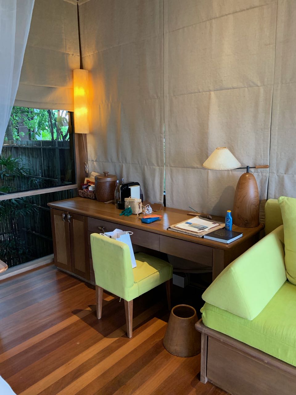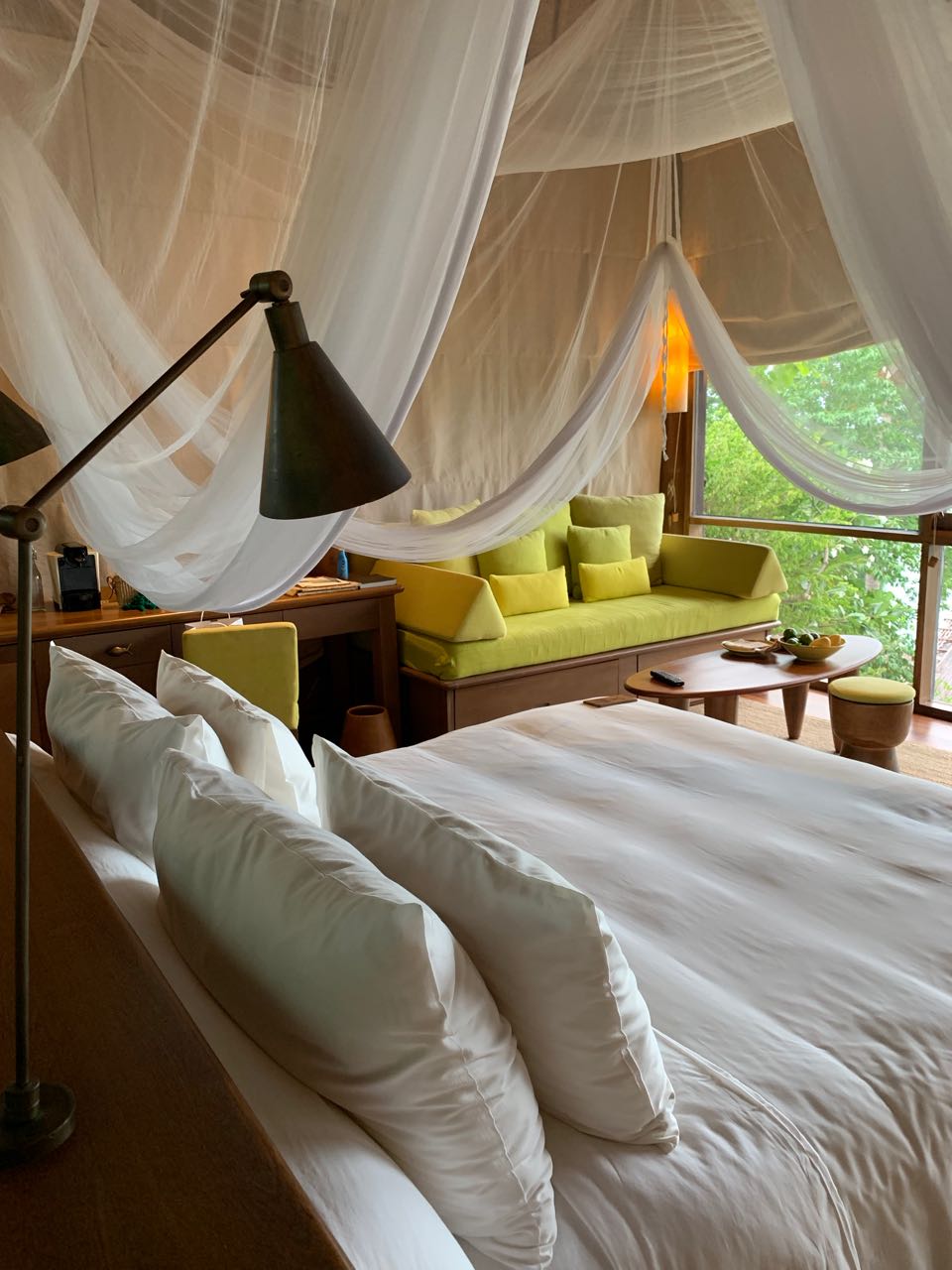 Minha suíte tinha uma cama king, com área de estar adjacente e TV. O frigobar lotado de cervejas Singha era tentador, mas (já que estava lá a trabalho) tive de me contentar com os cafés da Nespresso e beliscos fornecidos pelo hotel.
