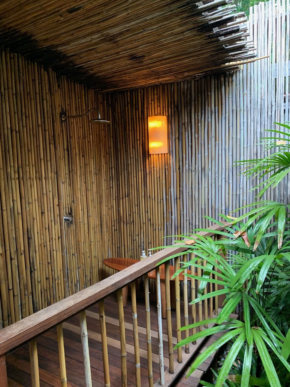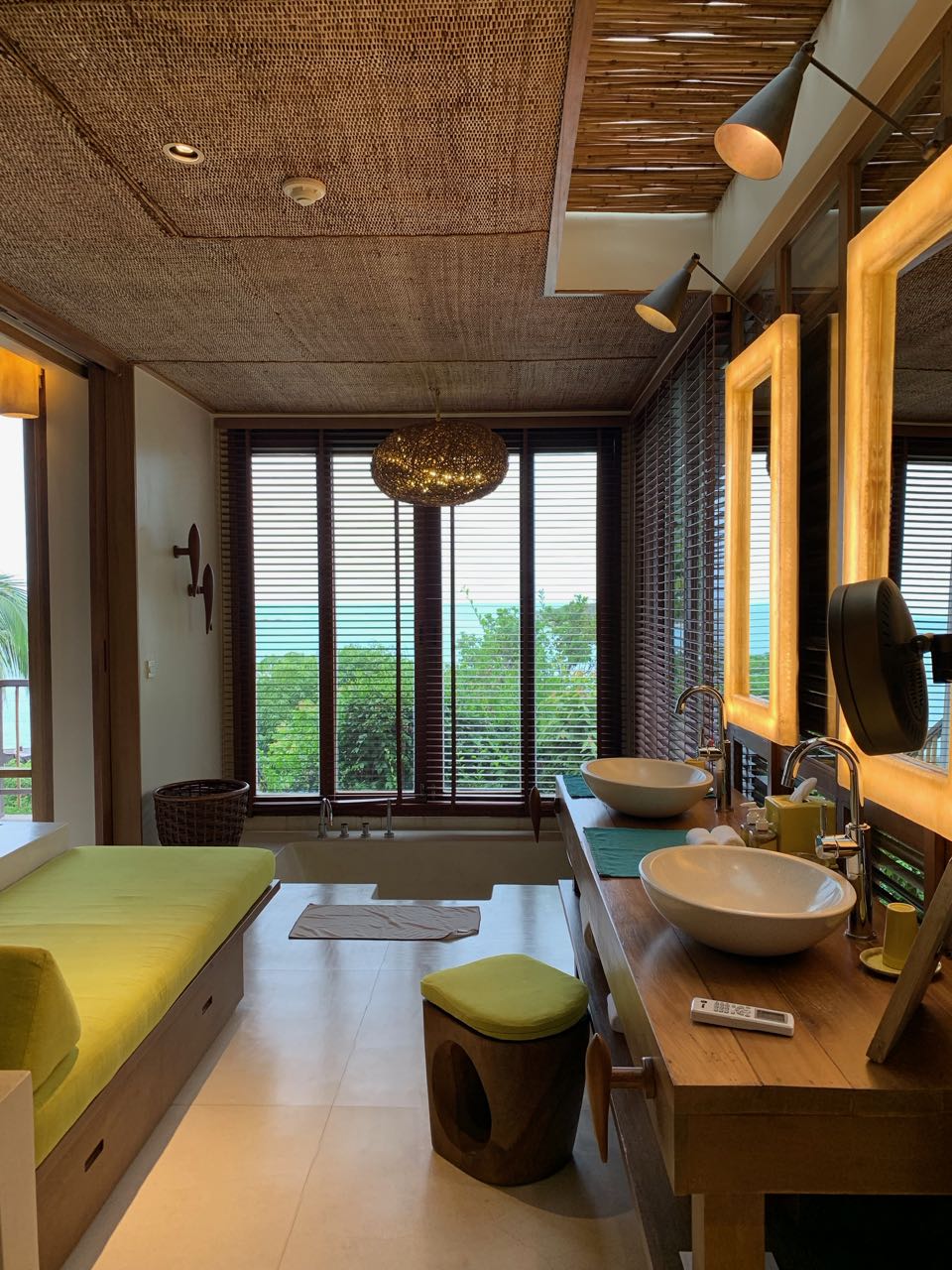 O banheiro era enorme e contava com uma banheira (com vista para o mar) e um chuveiro ao ar livre. O closet era bastante espaçoso e tinha uma excelente daybed, daquelas que toda mulher ama (para organizar as roupas no começo e no fim da estadia).